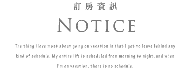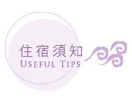 退房時間:上午11點以前 Check out:11:00am。(春節期間入住時間為當日17:00以後) |